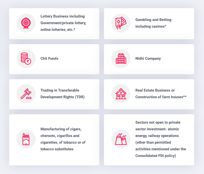 *Foreign technology collaboration in any form including licensing for franchise, trademark, brand name, or management contract is also prohibited for Lottery Business and Gambling and Betting activities
